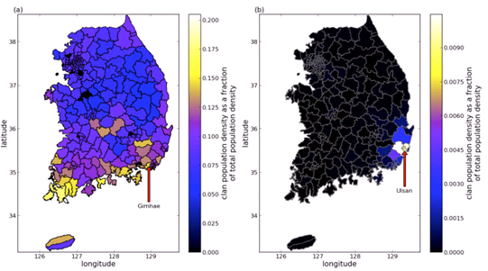본 연구결과는 13세기부터 기록된 10개 본관의 족보가 통계물리학 기법으로 분석되어 본관 인구의 분포 패턴과 이주의 메커니즘을 보여주고 있습니다.